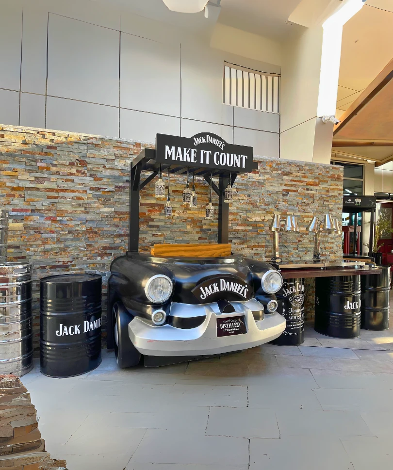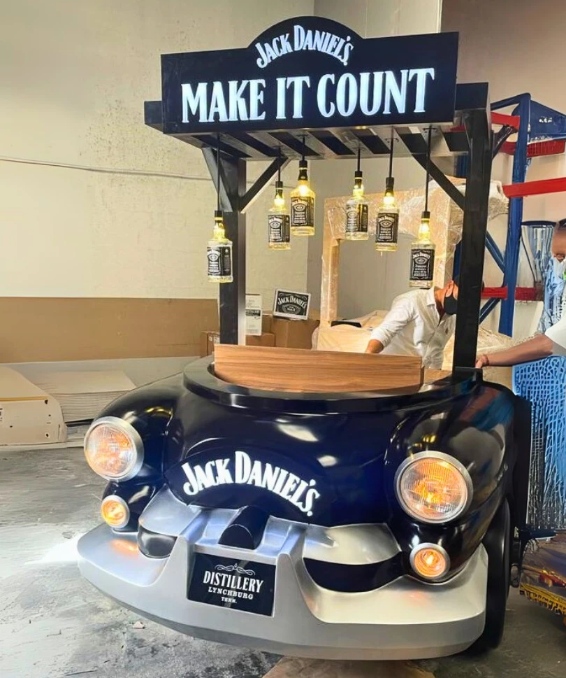 Custom GRP car bonnet counters designed as themed bar and display units, blending creativity with durable fiberglass fabrication.