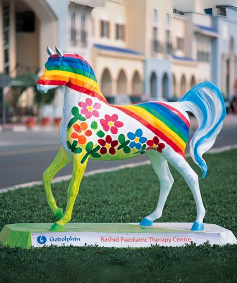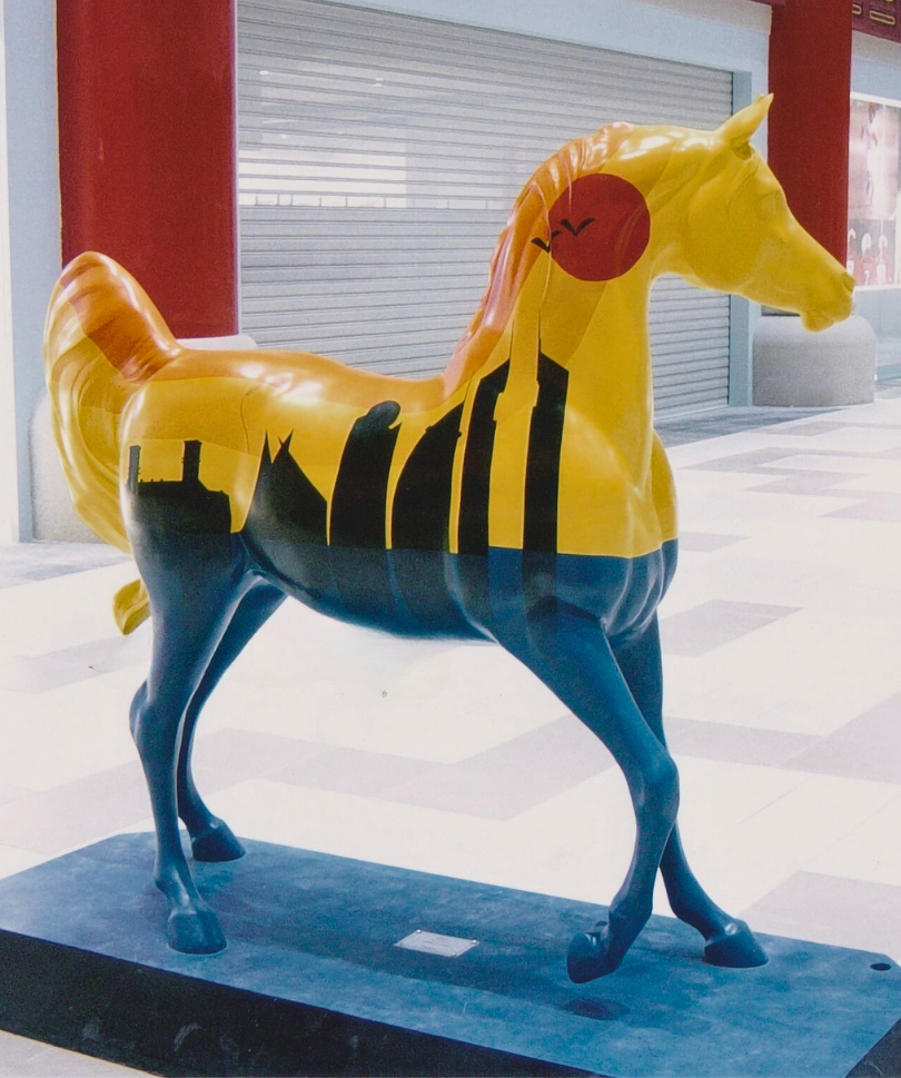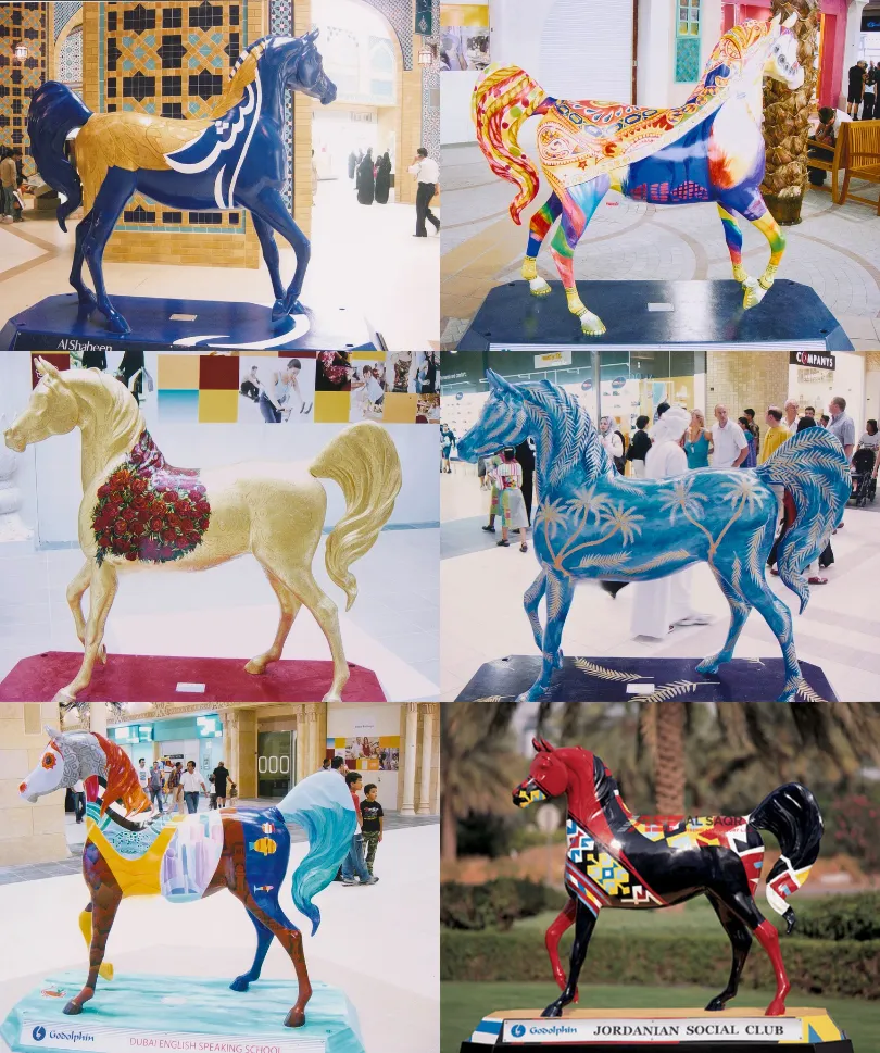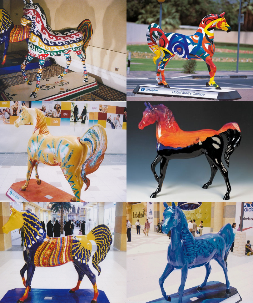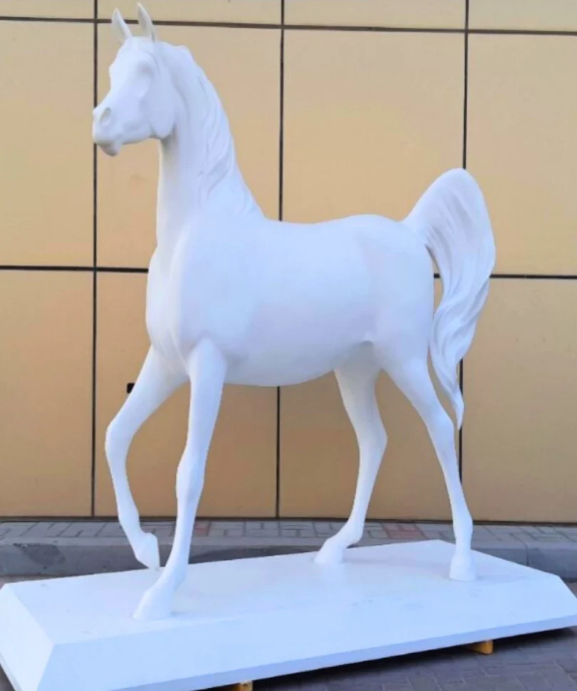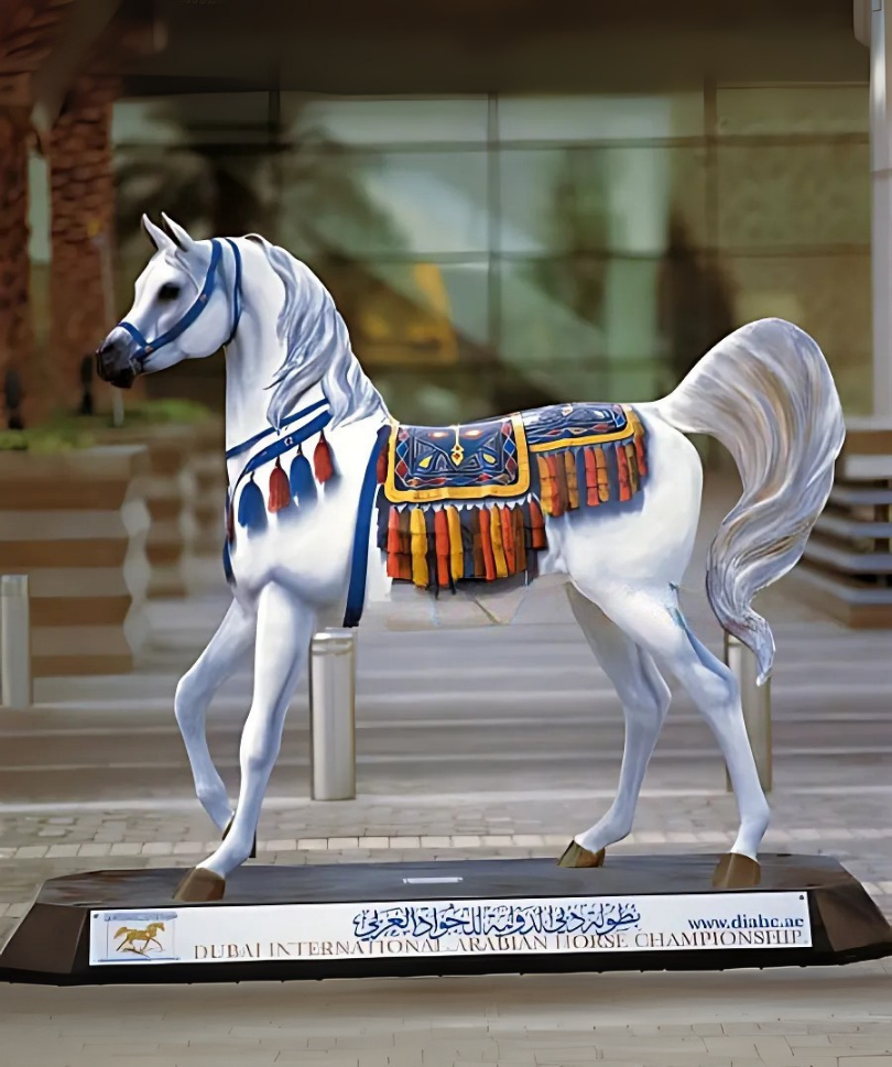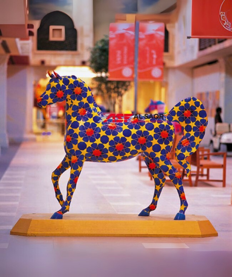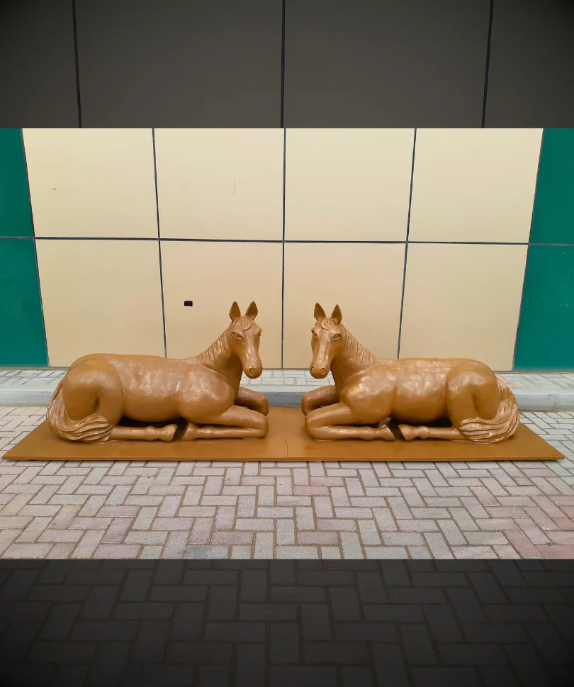 Detailed fiberglass horse sculptures crafted to life-size scale, enhancing event spaces, resorts, and urban landscaping projects.